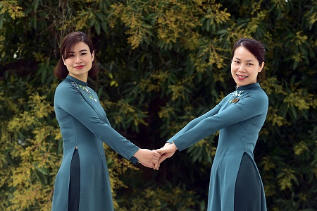 Chị em tranh thủ chụp những tấm ảnh đẹp trong tà áo dài truyền thống.